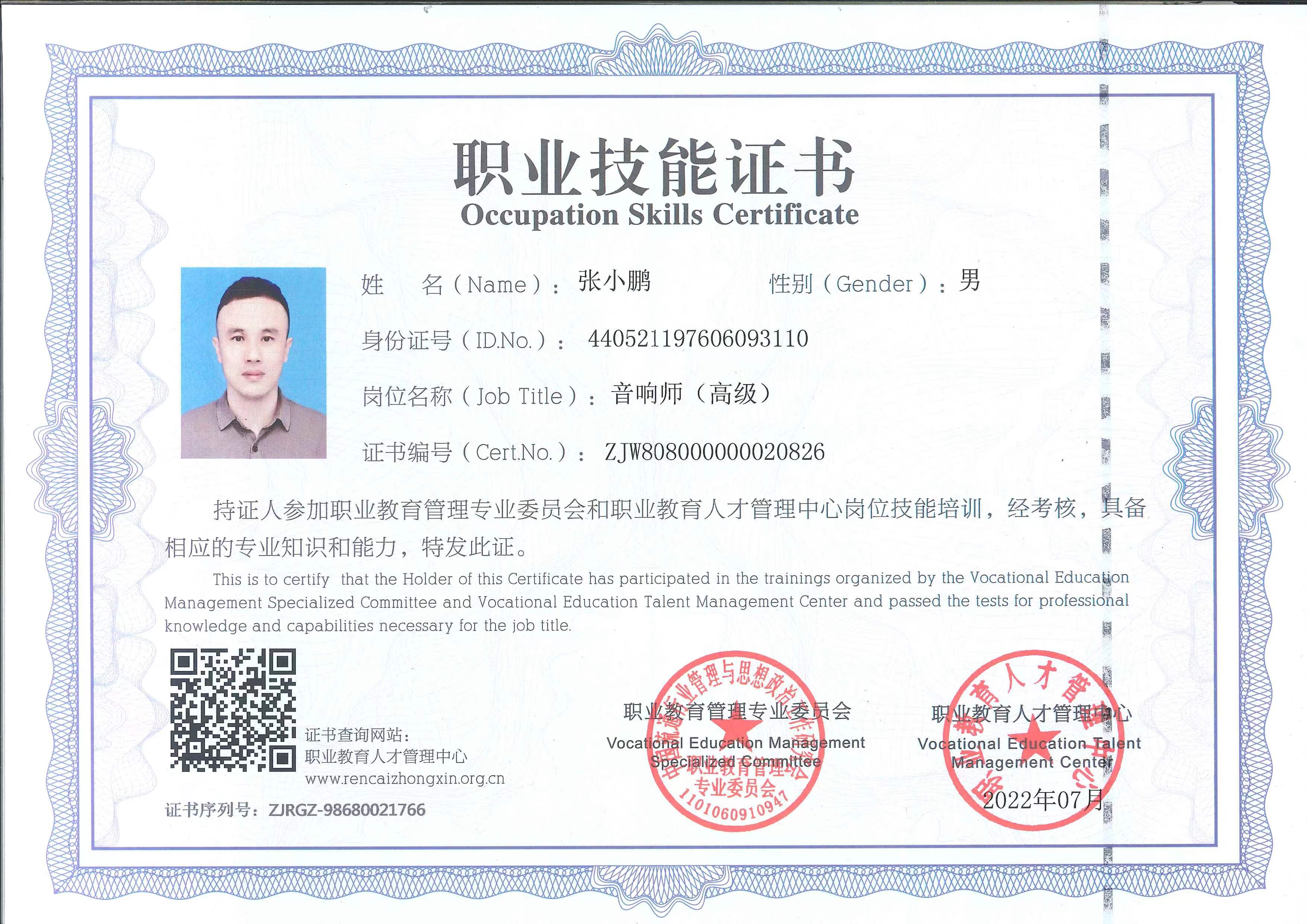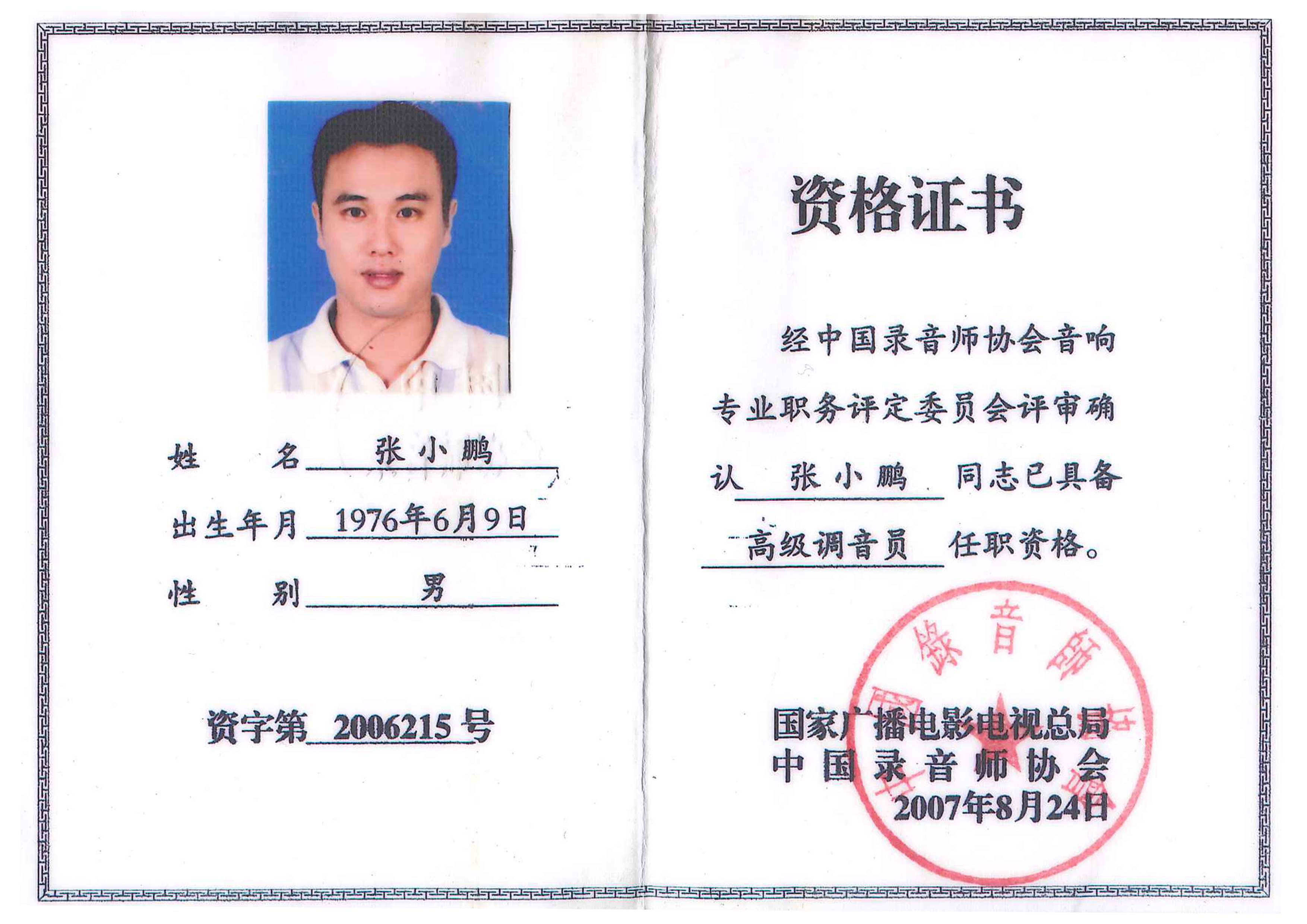 中國(guó)錄音師協(xié)會(huì)認(rèn)證:專業(yè)音響高級(jí)調(diào)音師
